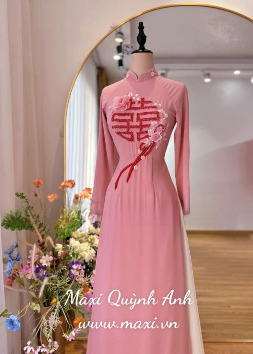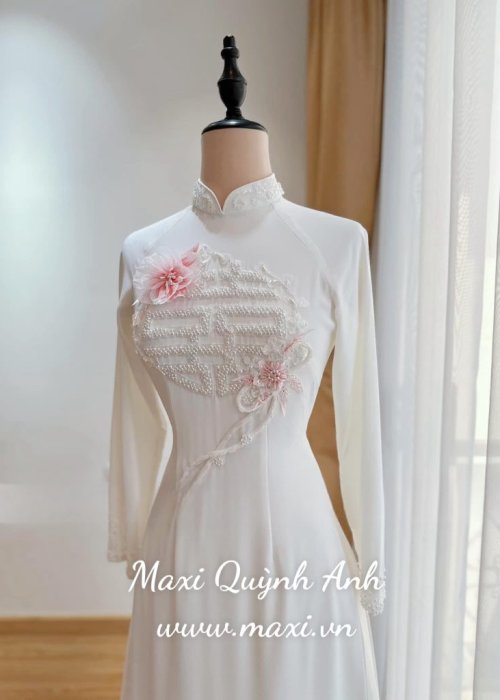 Áo dài cưới cao cấp chữ hỉ kết hoa nổi 3 màu đỏ trắng hồng
