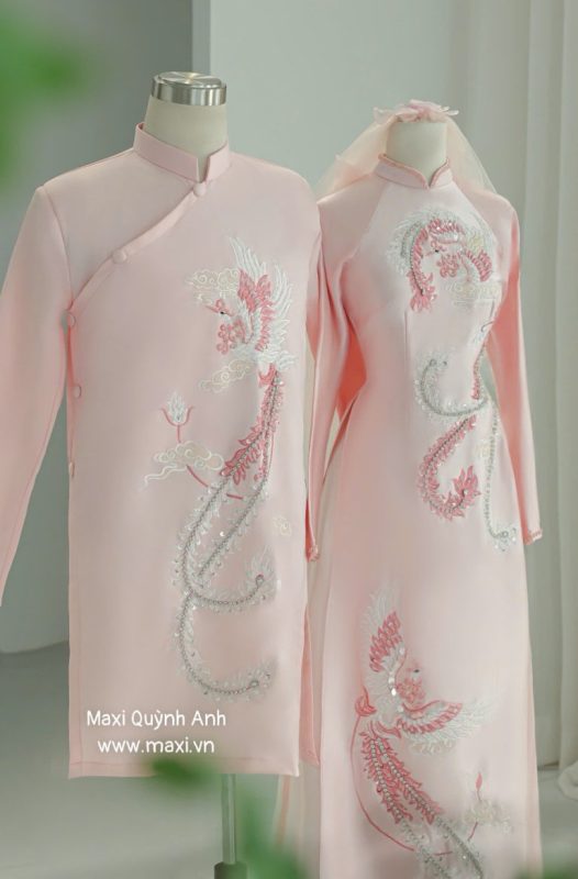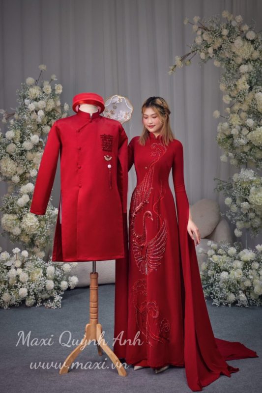 Trong bối cảnh ngày càng nhiều lễ cưới tổ chức theo phong cách hiện đại, áo dài cưới truyền thống vẫn giữ được chỗ đứng riêng nhờ giá trị tinh thần thiêng liêng mà nó mang lại. Mẫu áo dài thêu uyên ương – rồng phụ của Maxi Quỳnh Anh được chọn nhiều cho lễ ăn hỏi, lễ gia tiên, rước dâu, và cả chụp ảnh cưới theo concept hoài cổ – sang trọng.