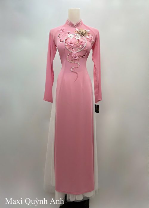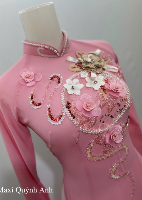 Chiếc áo dài màu hồng ngọt ngào được thiết kế trên nền vải cao cấp, tôn dáng uyển chuyển và đầy nữ tính. Điểm nhấn nổi bật chính là phần ngực áo được đính kết hoa nổi 3D kết hợp kim sa lấp lánh, mang lại vẻ đẹp vừa hiện đại vừa duyên dáng.