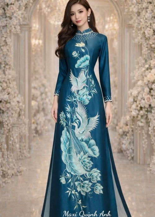 Áo Dài Trung Niên Xanh, Sui Gia -Thêu Ép Đá Hạc Liên Cát Tường