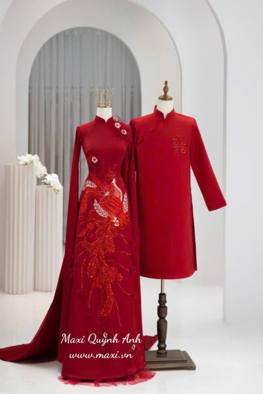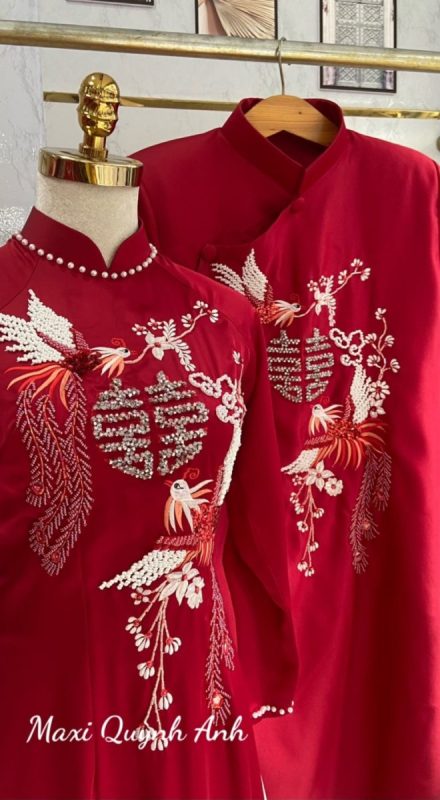 Đây là mẫu áo dài cưới được nhiều cô dâu lựa chọn nhất. Các họa tiết truyền thống như chim phượng hoàng, hoa sen, hoặc rồng phượng được thêu tay hoặc thêu máy một cách tỉ mỉ, tinh xảo trên nền vải đỏ. Những họa tiết này không chỉ mang ý nghĩa may mắn, hạnh phúc mà còn tạo nên sự lộng lẫy, uy nghi cho cô dâu. Vải gấm hoặc lụa là chất liệu lý tưởng để làm nổi bật các đường thêu này.