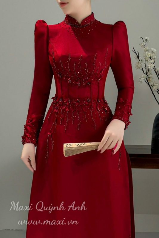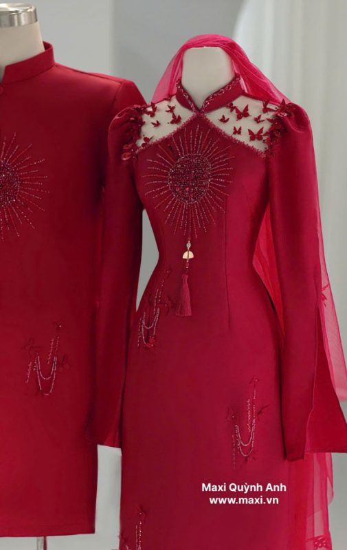 Để tăng thêm vẻ lộng lẫy và hiện đại, áo dài cưới đỏ có thể được kết hợp với các chi tiết ren và đá đính kết. Phần ren có thể được sử dụng ở tay áo, cổ áo hoặc dọc theo thân áo để tạo sự mềm mại, gợi cảm. Trong khi đó, những viên đá pha lê lấp lánh sẽ được đính kết khéo léo để tạo hiệu ứng bắt sáng, giúp cô dâu tỏa sáng dưới ánh đèn. Mẫu áo dài này đặc biệt phù hợp với những tiệc cưới được tổ chức vào buổi tối.