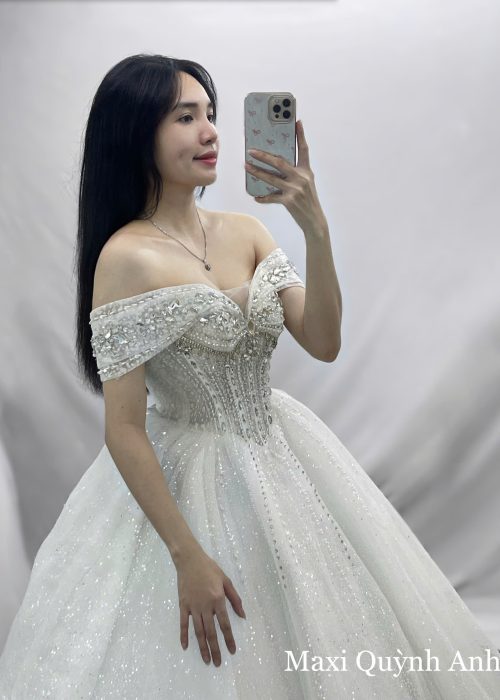Điểm nhấn nổi bật là phần thân áo cúp ngực corset được đính kết hàng ngàn viên đá và pha lê lấp lánh, tạo nên hiệu ứng lấp lánh 3D vô cùng rực rỡ. Phần vai áo trễ vai được trang trí bằng lông vũ mềm mại hoặc các chi tiết đính kết tinh xảo, tăng thêm vẻ kiêu sa và lộng lẫy cho cô dâu.