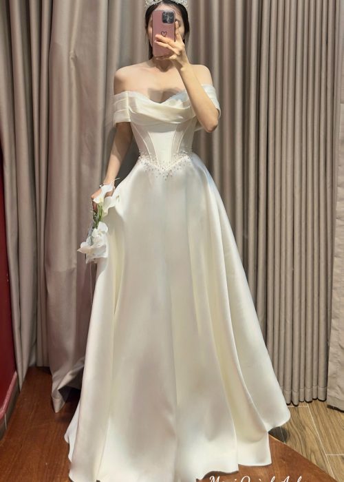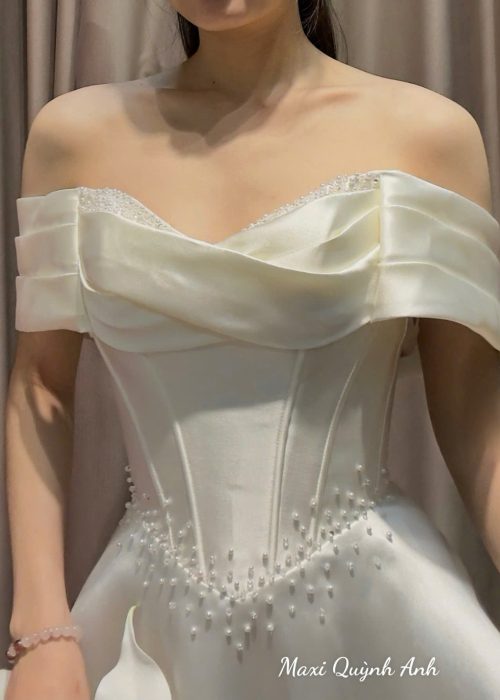 Thiết kế váy cưới trễ vai dáng chữ A nhẹ nhàng, giúp tôn bờ vai thon và tạo hiệu ứng vòng eo nhỏ gọn. Phần corset ôm eo được may tỉ mỉ, đính hạt ngọc trai li ti tạo điểm sáng tinh tế, giúp nàng dâu trở nên duyên dáng và đầy khí chất. ✨
