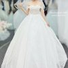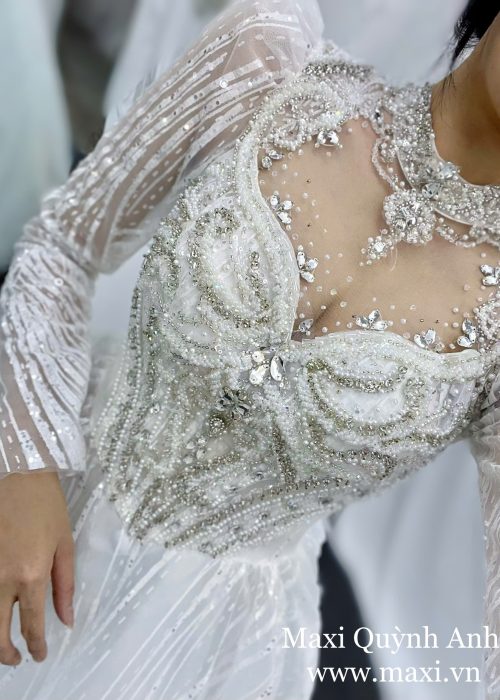 Ánh mắt mọi người đều hướng về – nàng dịu dàng trong tà áo dài cưới trắng tinh khôi, điểm xuyết những hạt ngọc trai óng ánh.
