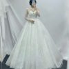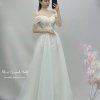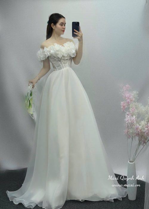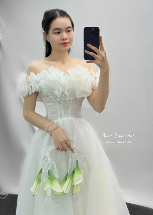 Chiếc váy cưới mang thiết kế trễ vai ôm sát, tôn trọn đường cong và nét yêu kiều của cô dâu. Phần ngực và vai được đính hoa 3D nổi vô cùng sống động, tạo điểm nhấn lãng mạn và sang trọng. Thân váy corset được may tinh xảo, giúp định hình vòng eo nhỏ gọn, kết hợp cùng chân váy xòe dài bồng bềnh từ chất liệu voan cao cấp tạo cảm giác nhẹ nhàng, bay bổng. Sự kết hợp giữa chi tiết hoa mềm mại và dáng váy thướt tha mang đến một vẻ đẹp vừa ngọt ngào vừa quý phái cho ngày trọng đại.