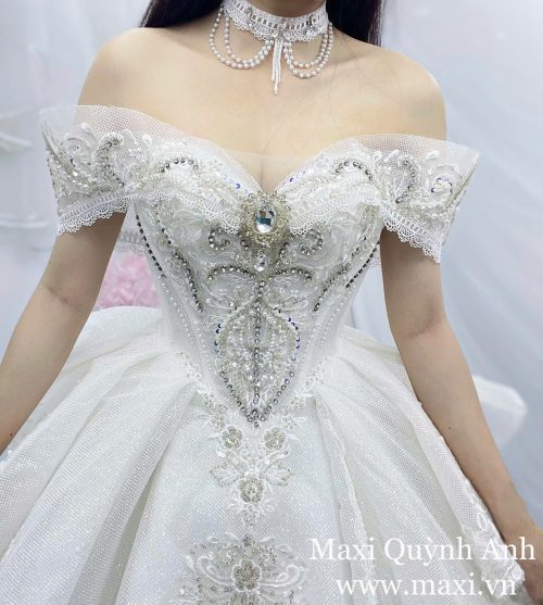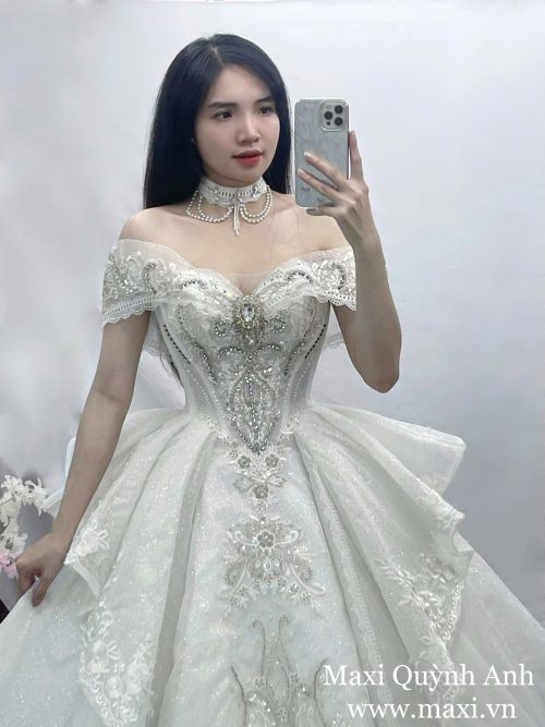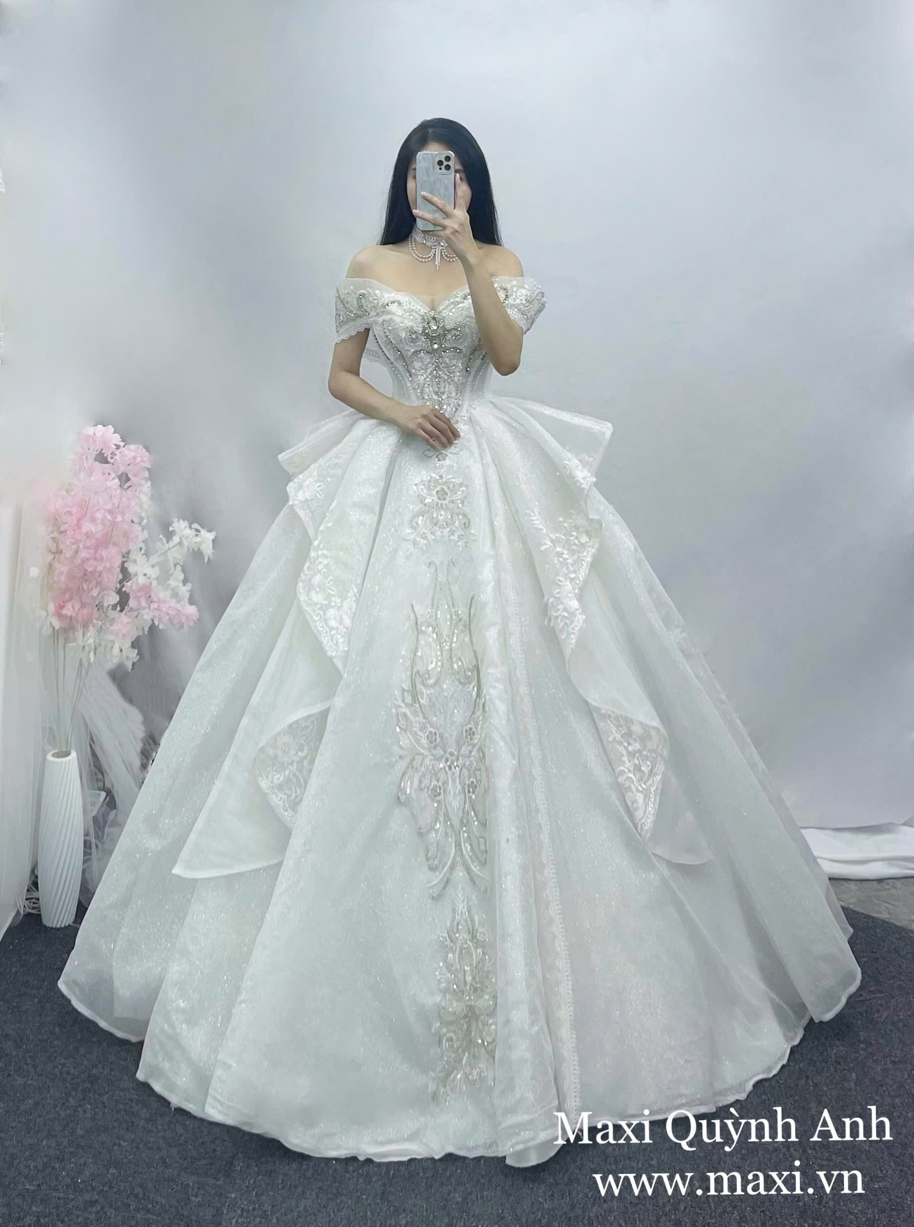 -Phom dáng: Ball gown sang trọng, phù hợp cho lễ cưới hoành tráng, tạo khoảnh khắc “wow” khi cô dâu xuất hiện..