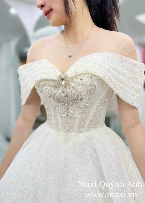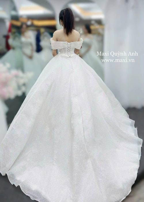 Chiếc váy cưới màu trắng tinh khôi mang vẻ đẹp lộng lẫy và kiêu sa, rất phù hợp cho ngày trọng đại. Phần thân trên được thiết kế cúp ngực với dáng trễ vai, để lộ bờ vai thon thả và quyến rũ. Thân áo ôm sát được thêu đính kim sa và họa tiết ren tinh xảo, tạo điểm nhấn nổi bật. Chân váy xòe bồng bềnh, được tạo nên từ nhiều lớp vải voan mỏng, phủ họa tiết hoa văn chìm tinh tế, tạo cảm giác lãng mạn và bay bổng. Chiếc khăn voan mỏng nhẹ, rũ xuống từ phía sau, càng làm tăng thêm vẻ đẹp dịu dàng, duyên dáng của cô dâu.
