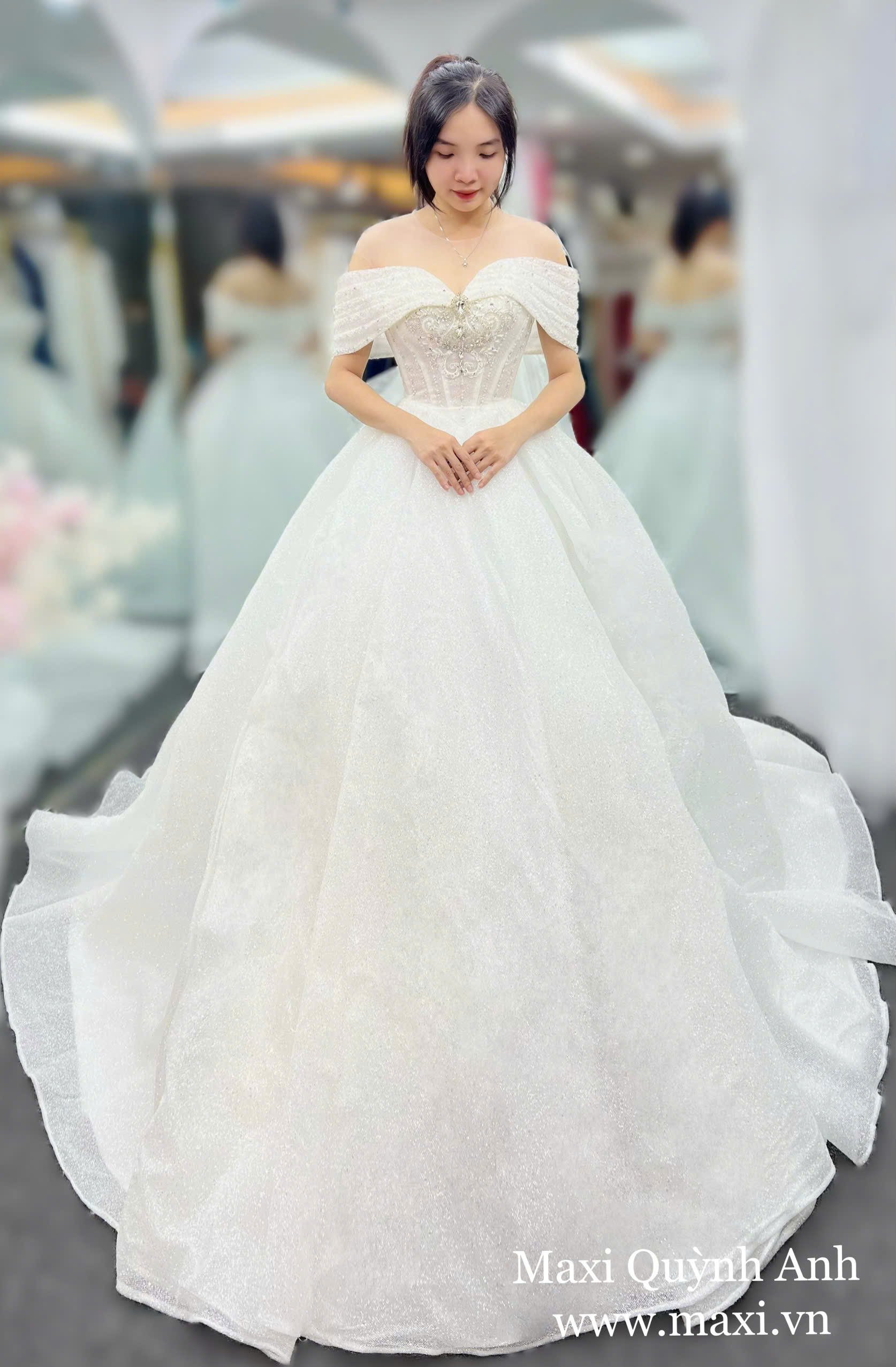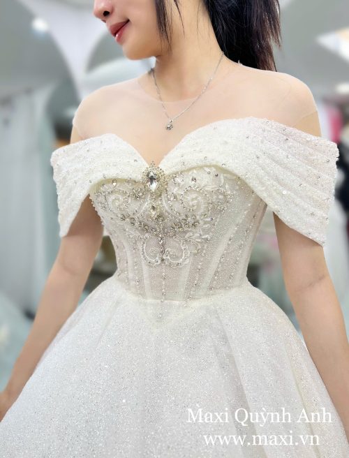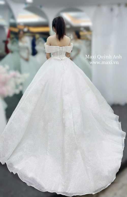 Chiếc váy cưới màu trắng tinh khôi mang vẻ đẹp lộng lẫy và kiêu sa, rất phù hợp cho ngày trọng đại. Phần thân trên được thiết kế cúp ngực với dáng trễ vai, để lộ bờ vai thon thả và quyến rũ. Thân áo ôm sát được thêu đính kim sa và họa tiết ren tinh xảo, tạo điểm nhấn nổi bật. Chân váy xòe bồng bềnh, được tạo nên từ nhiều lớp vải voan mỏng, phủ họa tiết hoa văn chìm tinh tế, tạo cảm giác lãng mạn và bay bổng. Chiếc khăn voan mỏng nhẹ, rũ xuống từ phía sau, càng làm tăng thêm vẻ đẹp dịu dàng, duyên dáng của cô dâu.
