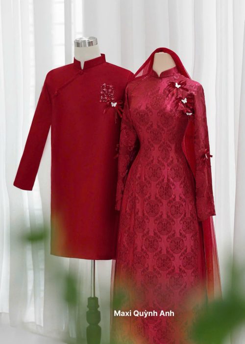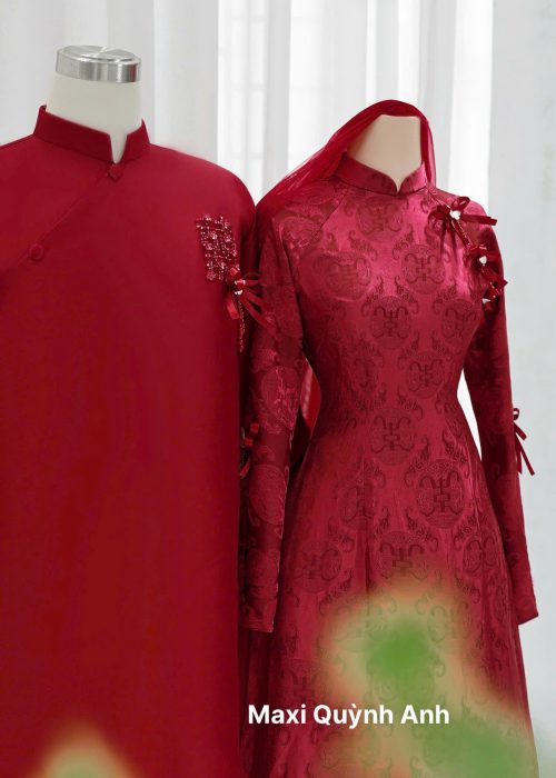 Áo dài cưới đỏ trên nền vải gấm cao cấp – biểu tượng cho quyền uy, hạnh phúc và phúc lộc trọn đời. Chất liệu gấm không chỉ giữ form chuẩn mà còn phản chiếu ánh sáng nhẹ nhàng, giúp cô dâu nổi bật trong từng bước đi. Một thiết kế mang đậm bản sắc truyền thống nhưng vẫn đủ tinh tế để trở thành tâm điểm trong ngày trọng đại