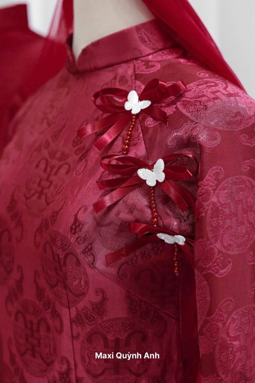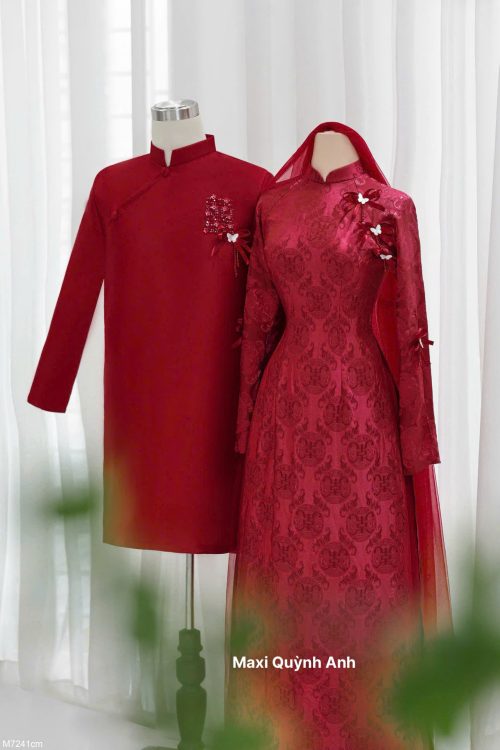 Áo dài cưới đỏ trên nền vải gấm cao cấp – biểu tượng cho quyền uy, hạnh phúc và phúc lộc trọn đời. Chất liệu gấm không chỉ giữ form chuẩn mà còn phản chiếu ánh sáng nhẹ nhàng, giúp cô dâu nổi bật trong từng bước đi. Một thiết kế mang đậm bản sắc truyền thống nhưng vẫn đủ tinh tế để trở thành tâm điểm trong ngày trọng đại