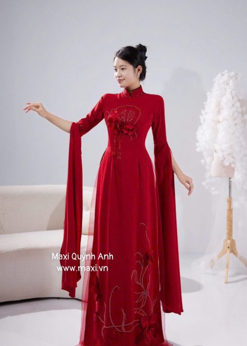 Đây là một chiếc áo dài cô dâu màu đỏ thẫm, mang vẻ đẹp lộng lẫy và kiêu sa. Áo có phom dáng ôm sát, tôn lên đường cong, với cổ cao truyền thống và tay áo loe rộng, xẻ tà ấn tượng, tạo sự bay bổng và lãng mạn. Điểm nhấn nổi bật là họa tiết hoa được thêu và đính kết tinh xảo ở phần ngực và chân váy, với các đường nét uốn lượn mềm mại. Áo được may hai lớp, với lớp lụa bên trong và lớp voan mỏng bên ngoài, tạo sự thướt tha. Chiếc áo dài này rất phù hợp cho những cô dâu yêu thích vẻ đẹp nổi bật, quý phái trong ngày cưới.