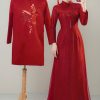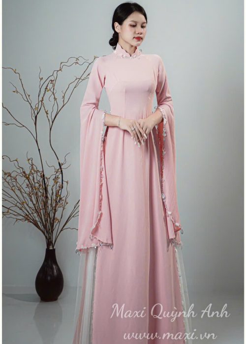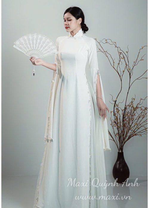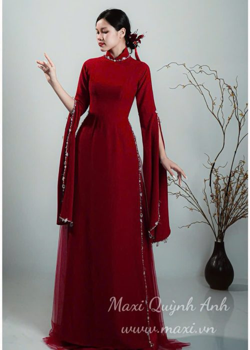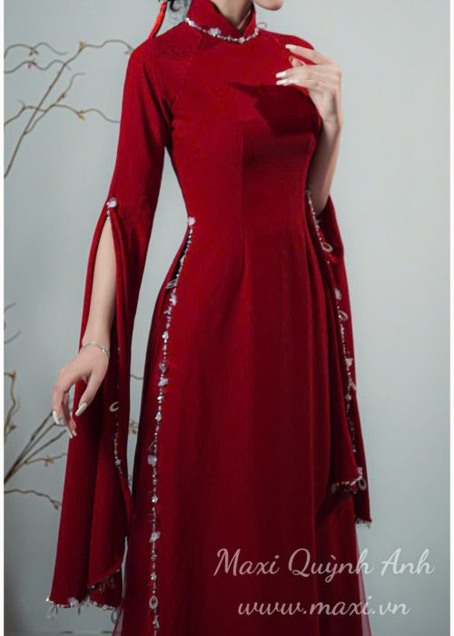 Điểm nhấn độc đáo và đắt giá nhất nằm ở phần tay áo xẻ tà, bung xòe mềm mại như đôi cánh phượng hoàng. Viền cổ, tay áo và hai bên tà được đính kết thủ công bằng hàng ngàn viên đá và cườm lấp lánh, tạo hiệu ứng bắt sáng tuyệt vời theo mỗi chuyển động. Trên nền chất liệu lụa cát cao cấp, phom dáng áo dài được giữ vững nét truyền thống, tôn lên vóc dáng mảnh mai của người mặc. Mẫu thiết kế có nhiều gam màu thời thượng như đỏ rượu vang, trắng tinh khôi và hồng pastel để bạn lựa chọn.