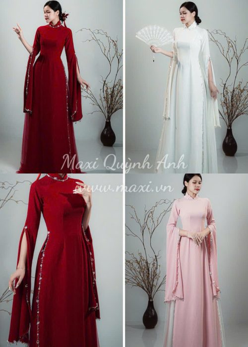 Điểm nhấn độc đáo và đắt giá nhất nằm ở phần tay áo xẻ tà, bung xòe mềm mại như đôi cánh phượng hoàng. Viền cổ, tay áo và hai bên tà được đính kết thủ công bằng hàng ngàn viên đá và cườm lấp lánh, tạo hiệu ứng bắt sáng tuyệt vời theo mỗi chuyển động. Trên nền chất liệu lụa cát cao cấp, phom dáng áo dài được giữ vững nét truyền thống, tôn lên vóc dáng mảnh mai của người mặc. Mẫu thiết kế có nhiều gam màu thời thượng như đỏ rượu vang, trắng tinh khôi và hồng pastel để bạn lựa chọn.
