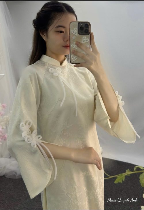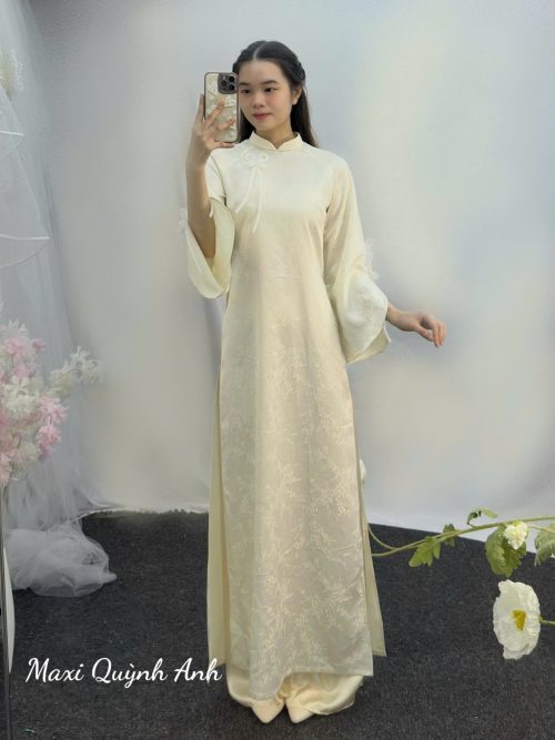 Áo dài cưới gấm trắng ngà – Tinh khôi và trang nhã