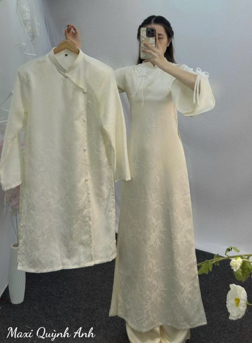 Cặp áo dài thiết kế từ chất liệu gấm cao cấp với hoa văn dập nổi tinh tế, mang đến sự sang trọng nhẹ nhàng và thuần khiết. Áo dài cô dâu được may dáng ôm cổ điển, tay dài, phần ngực phối chi tiết bấm nút duyên dáng.