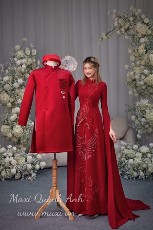Nổi bật với sắc đỏ may mắn – biểu tượng của hỷ sự và tình yêu viên mãn, cặp áo dài được thêu hoa văn tinh xảo kết hợp đính kết thủ công tỉ mỉ, tạo nên diện mạo sang trọng và cuốn hút.