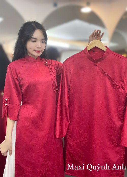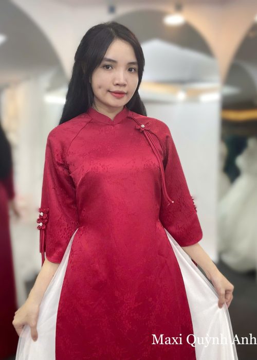 Chiếc áo dài được may từ chất liệu gấm cao cấp, nổi bật với gam màu đỏ đô sang trọng và quý phái. Chất liệu gấm có độ dày dặn vừa phải, tạo phom áo đứng dáng nhưng vẫn giữ được sự mềm mại, duyên dáng.