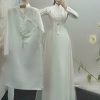 Đặc điểm nổi bật là họa tiết chìm hoa mai hoặc hoa đào được dệt trực tiếp trên nền vải gấm, tạo hiệu ứng thị giác tinh tế, cổ điển mà không cần đính kết cầu kỳ.