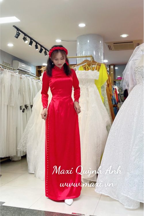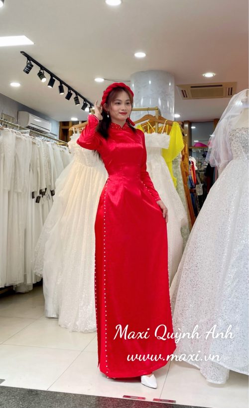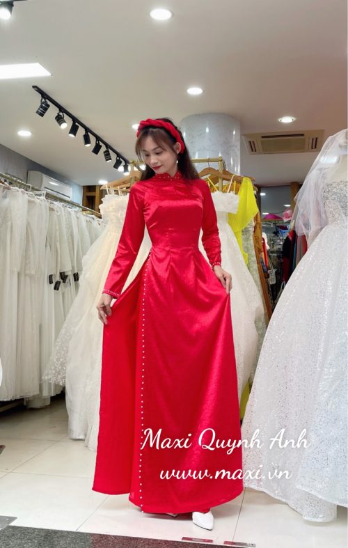 Áo Dài Cách Tân Gấm Đỏ Thiết Kế Viền Ngọc Trai
