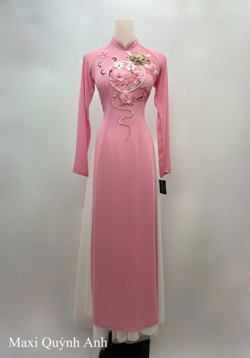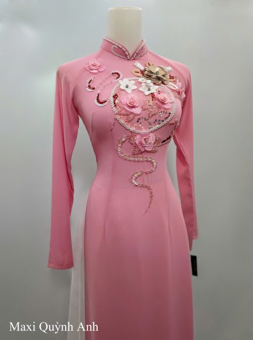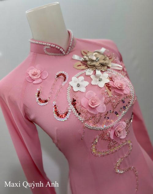 Chiếc áo dài màu hồng ngọt ngào được thiết kế trên nền vải cao cấp, tôn dáng uyển chuyển và đầy nữ tính. Điểm nhấn nổi bật chính là phần ngực áo được đính kết hoa nổi 3D kết hợp kim sa lấp lánh, mang lại vẻ đẹp vừa hiện đại vừa duyên dáng.