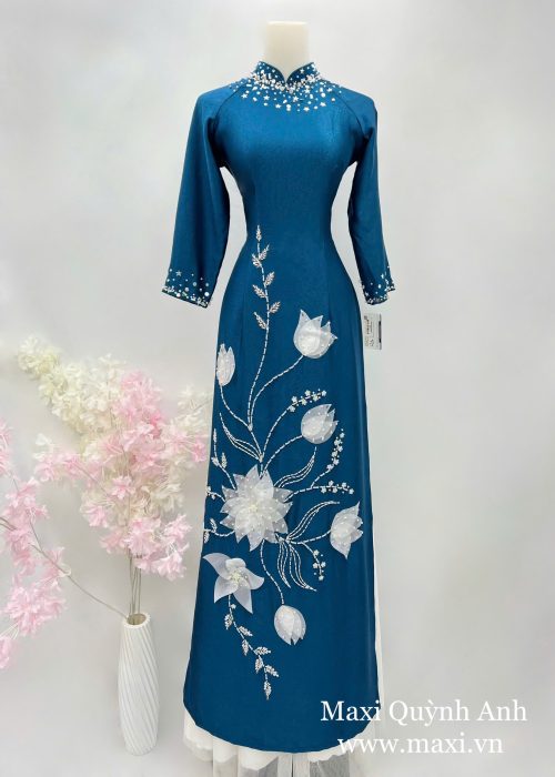 Áo Dài Sui Xanh Đậm Thêu Hoa 3D