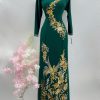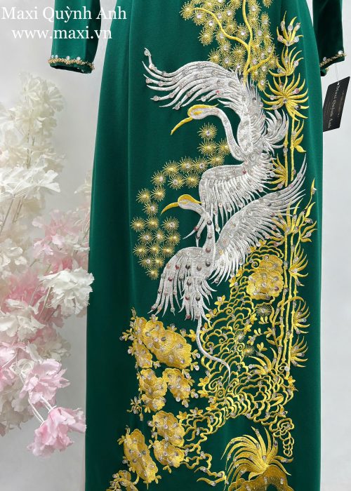Áo Dài Sui Xanh Lá Thêu Hạc và Hoa Vàng