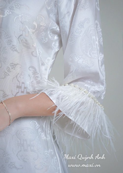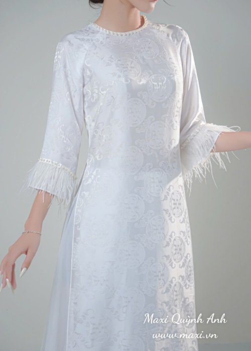 Phong cách: Chiếc áo dài trắng mang vẻ đẹp thuần khiết, thanh lịch và sang trọng. Thiết kế hiện đại kết hợp với nét truyền thống, phần tay áo được điểm xuyết chi tiết lông vũ nhẹ nhàng tạo điểm nhấn độc đáo, giúp tổng thể trở nên tinh tế và quyến rũ hơn. Đây là lựa chọn lý tưởng cho cô dâu hoặc những quý cô yêu thích sự nhẹ nhàng, trang nhã.