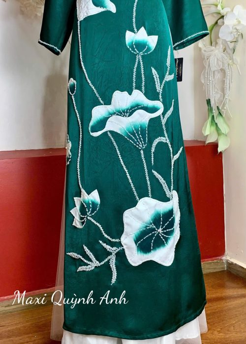 Điểm nhấn là họa tiết Hoa Sen tinh khiết được thêu đắp nổi 3D, với đường viền đính kết pha lê lấp lánh.