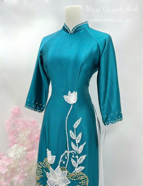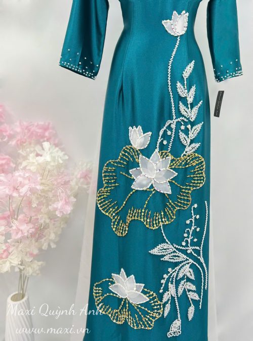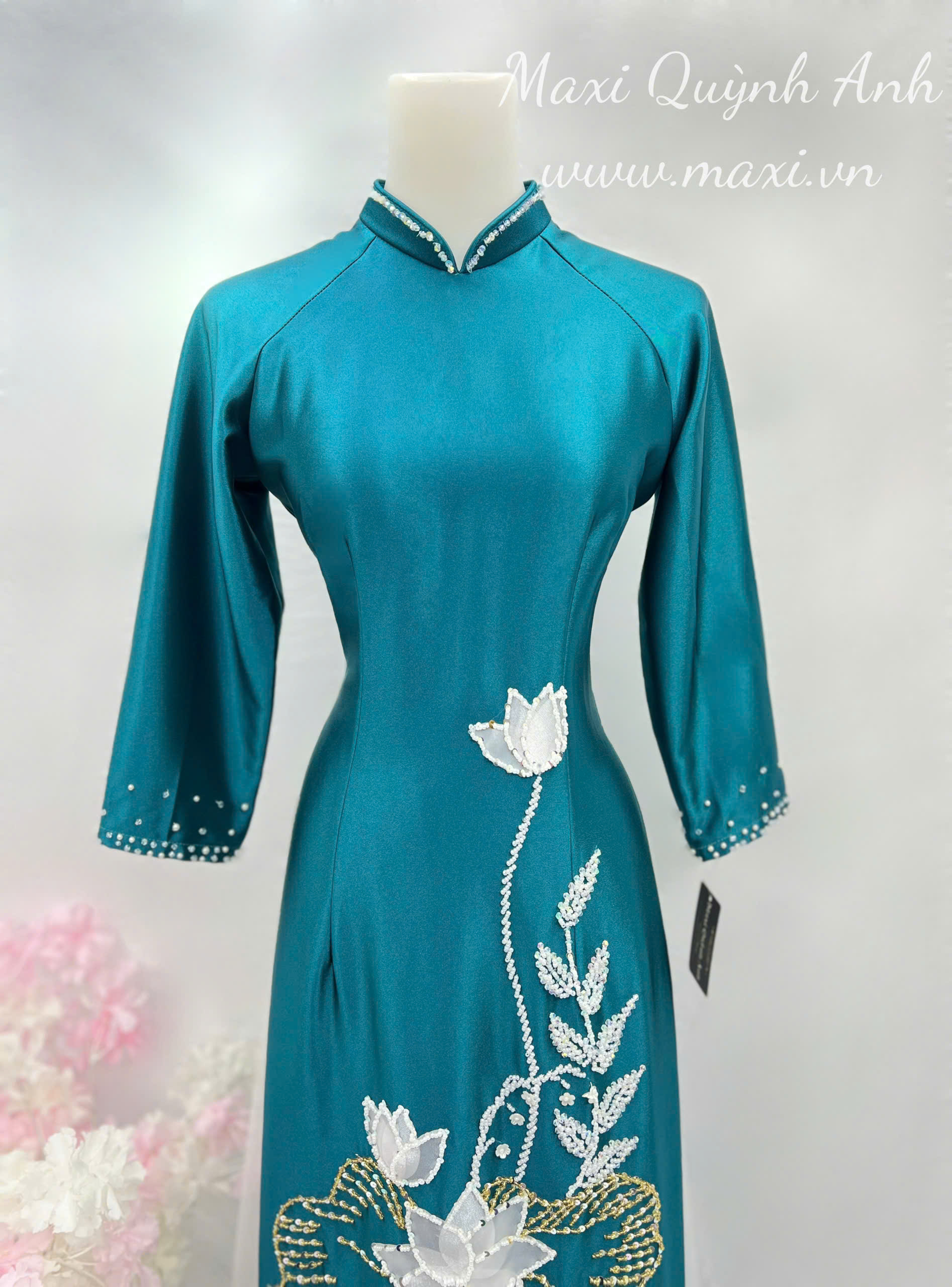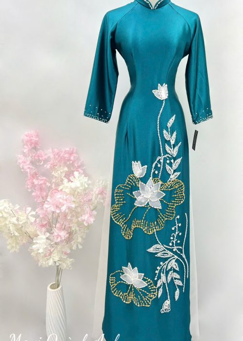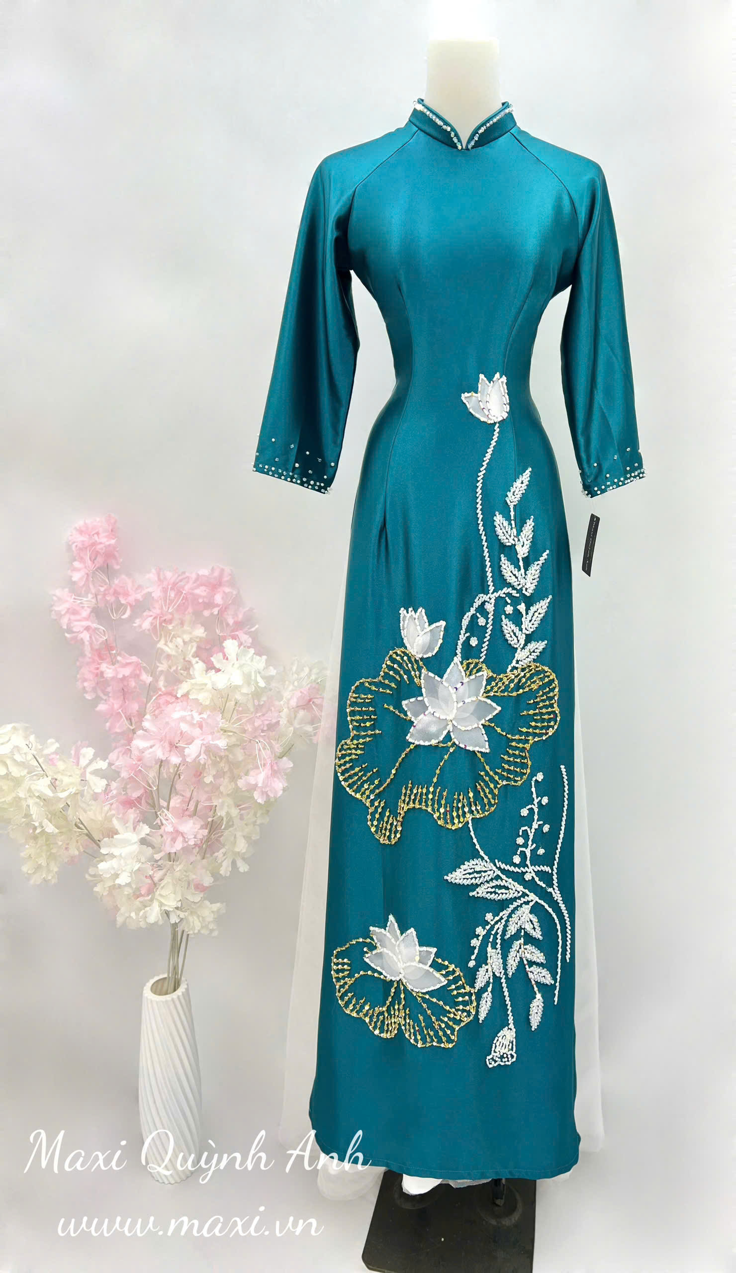 Áo Dài Sui Xanh Sen Vàng Trắng
