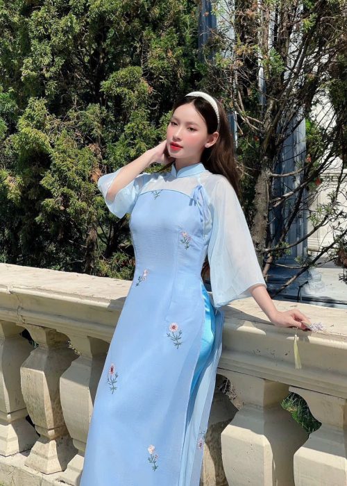 Áo Dài Cách Tân Xanh Thêu Hoa
