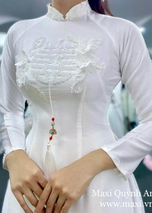 Sở hữu màu trắng sang trọng, cặp áo dài cưới này được may từ lụa cao cấp mềm mịn, mang lại cảm giác nhẹ nhàng nhưng vẫn giữ phom dáng hoàn hảo. Áo nữ thiết kế cổ cao truyền thống, tay dài, tà suông thướt tha, điểm nhấn là họa tiết thêu tay tỉ mỉ ở ngực – tượng trưng cho sự thuần khiết và viên mãn. Áo nam phối đồng điệu, phom đứng, tối giản nhưng tinh tế, giúp tôn lên vẻ lịch lãm.