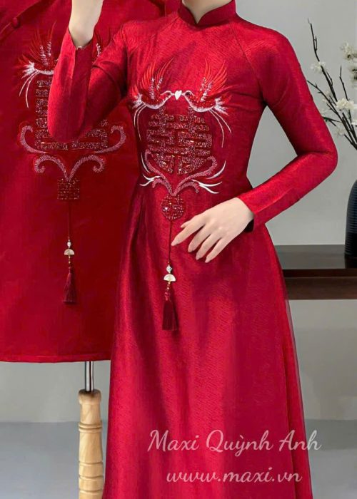 Mẫu áo dài cưới truyền thống tông đỏ ruby nổi bật, được thiết kế dành riêng cho cô dâu – chú rể trong ngày lễ ăn hỏi, lễ vu quy hoặc lễ thành hôn.