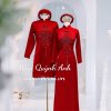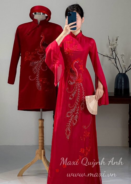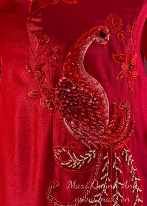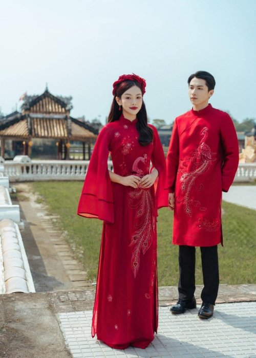 Khoác lên mình thiết kế áo dài cặp cách tân đầy tinh tế, hai bạn sẽ trở thành tâm điểm của ngày trọng đại. Trên nền vải gấm lụa cao cấp màu đỏ nồng nàn, họa tiết chim công được thêu nổi 3D một cách tỉ mỉ và sắc sảo, biểu tượng cho tình yêu son sắt, sự cao quý và phú quý.