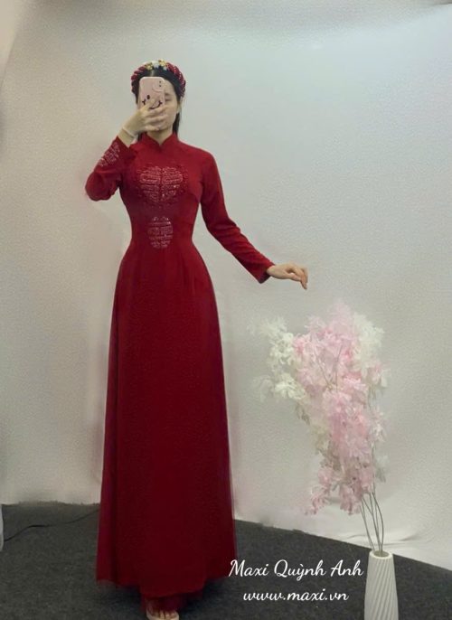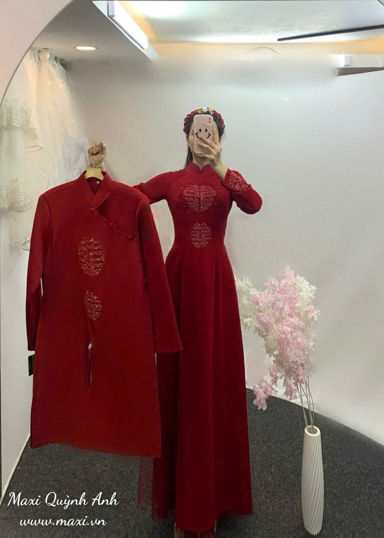 Lấy cảm hứng từ nét đẹp cưới hỏi truyền thống Việt Nam, cặp áo dài cưới màu đỏ được kết chữ ‘Hỷ’ là biểu tượng trọn vẹn cho niềm vui song hỷ lâm môn – vừa là ngày vui của đôi lứa, vừa là sự khởi đầu viên mãn cho một gia đình mới. Trên nền vải đỏ thắm – sắc màu tượng trưng cho may mắn, thịnh vượng và tình yêu bền chặt – từng chữ ‘Hỷ’ được kết nổi thủ công bằng ngọc, đá, tạo nên điểm nhấn trang trọng và đầy ý nghĩa.