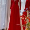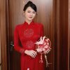 Cặp áo dài cưới đỏ được thiết kế từ lụa vân gỗ cao cấp, mang đến độ bóng mượt và sự thoải mái tối đa khi mặc.