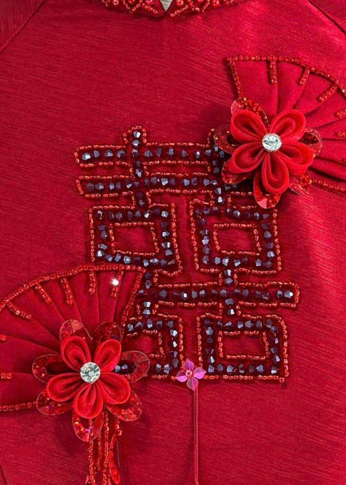 Áo cô dâu màu đỏ ruby quyến rũ, với họa tiết thêu nổi và đính kết hạt cườm tinh xảo ở ngực áo. Áo chú rể lịch lãm với thiết kế cổ trụ và họa tiết đồng điệu, thể hiện sự mạnh mẽ và quyền quý.