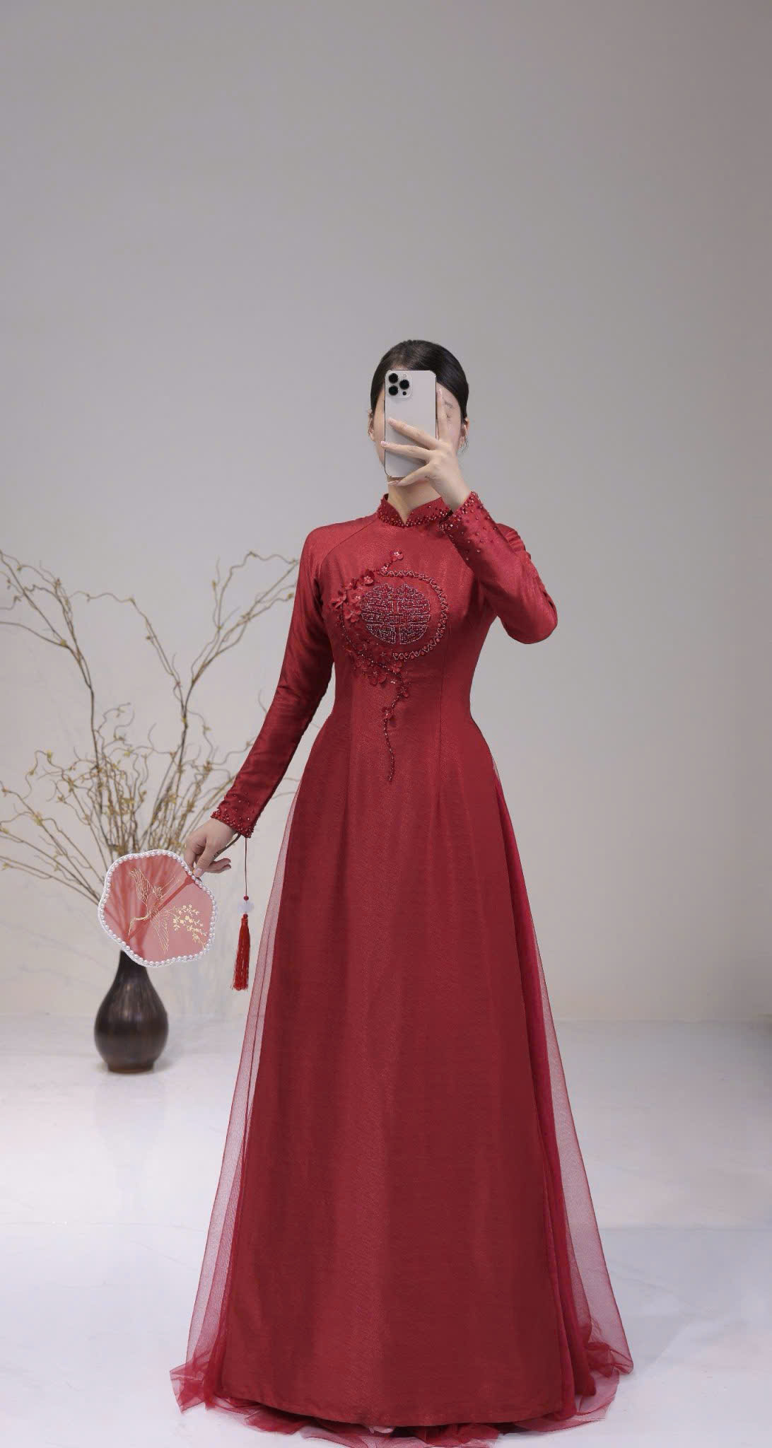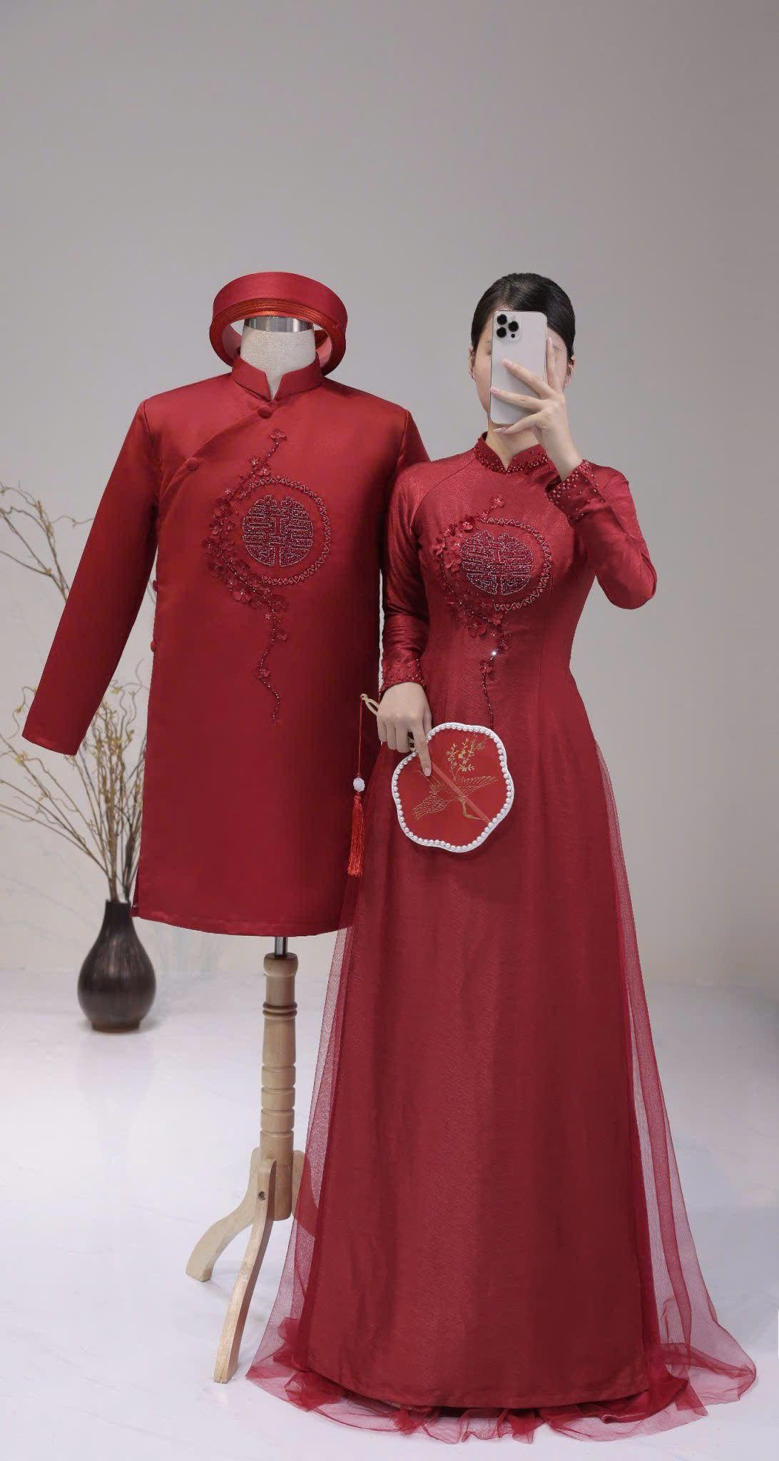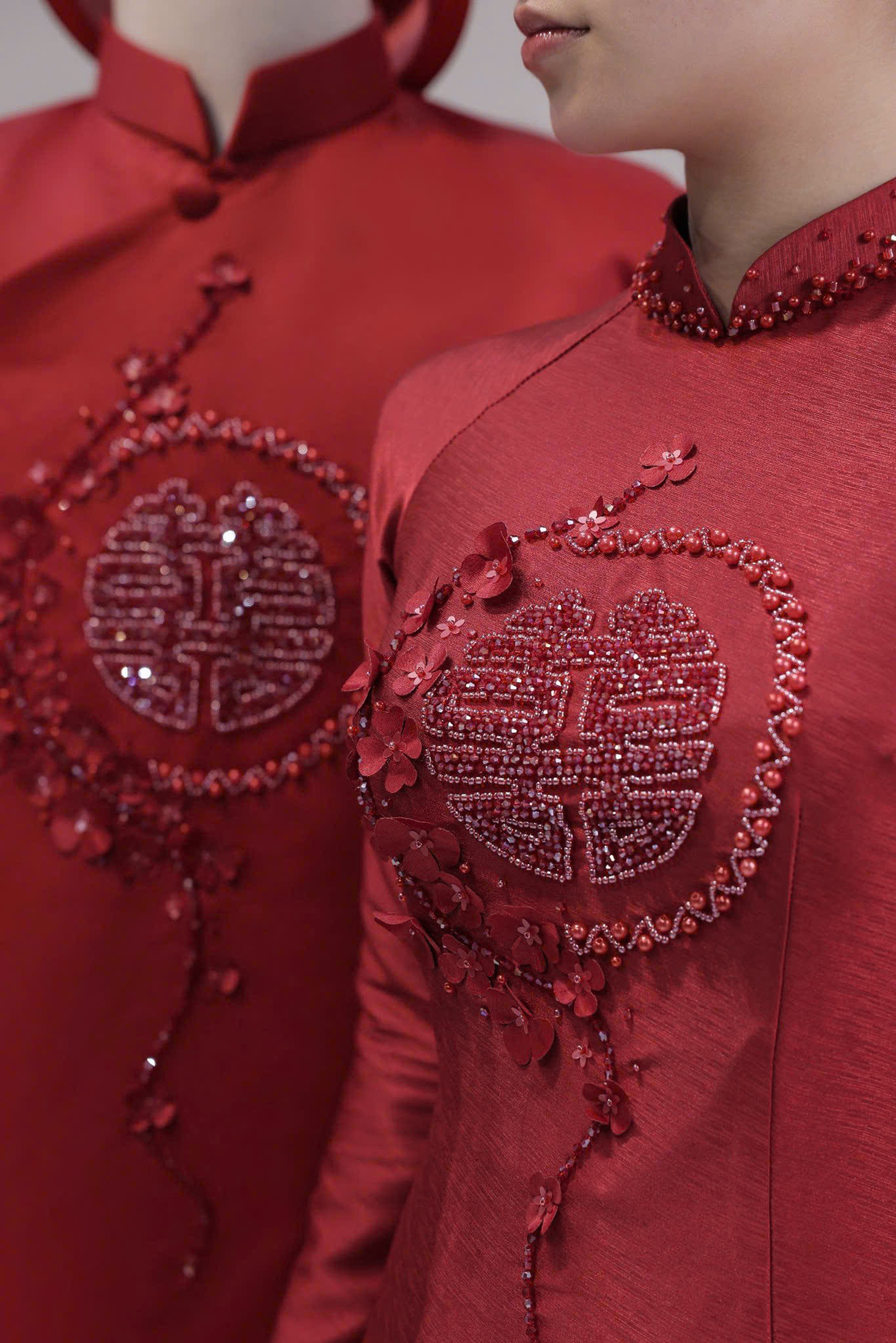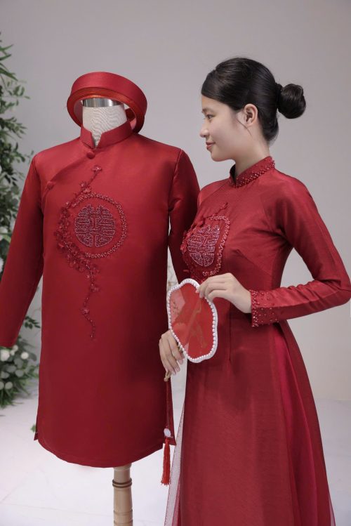 Khoác lên mình bộ áo dài cưới này, cô dâu và chú rể như bước ra từ một bức tranh hoàng gia, nơi vẻ đẹp truyền thống giao thoa hoàn hảo cùng nét tinh tế của thời trang đương đại. Sắc đỏ đô trầm ấm, sang trọng không chỉ tượng trưng cho tình yêu nồng cháy mà còn thể hiện sự đẳng cấp và gu thẩm mỹ tinh tế.