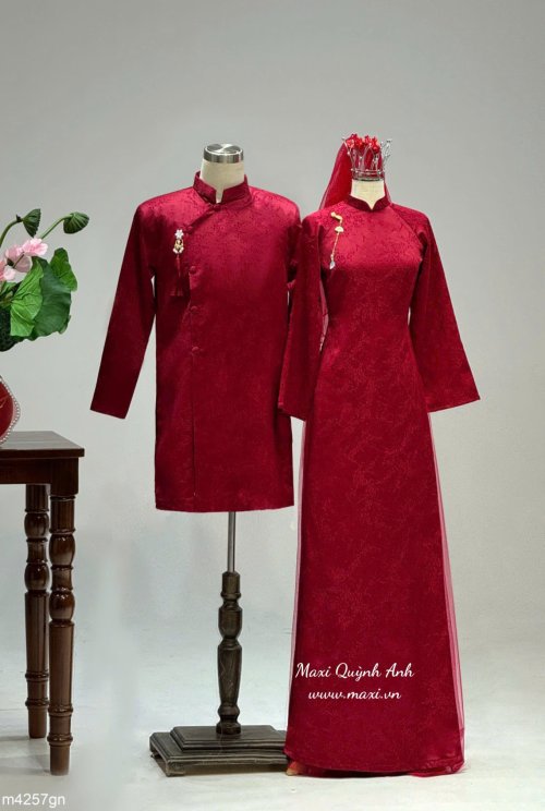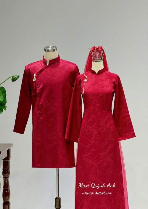 Áo dài cưới đỏ trên nền vải gấm cao cấp – biểu tượng cho quyền uy, hạnh phúc và phúc lộc trọn đời. Chất liệu gấm không chỉ giữ form chuẩn mà còn phản chiếu ánh sáng nhẹ nhàng, giúp cô dâu nổi bật trong từng bước đi. Một thiết kế mang đậm bản sắc truyền thống nhưng vẫn đủ tinh tế để trở thành tâm điểm trong ngày trọng đại