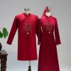 Nổi bật nhất là chữ “Song Hỷ” được kết cườm và thêu nổi 3D vô cùng công phu ngay trên ngực áo, điểm xuyết cùng những đóa hoa văn và chi tiết tua rua trang nhã, tượng trưng cho hạnh phúc lứa đôi viên mãn.
