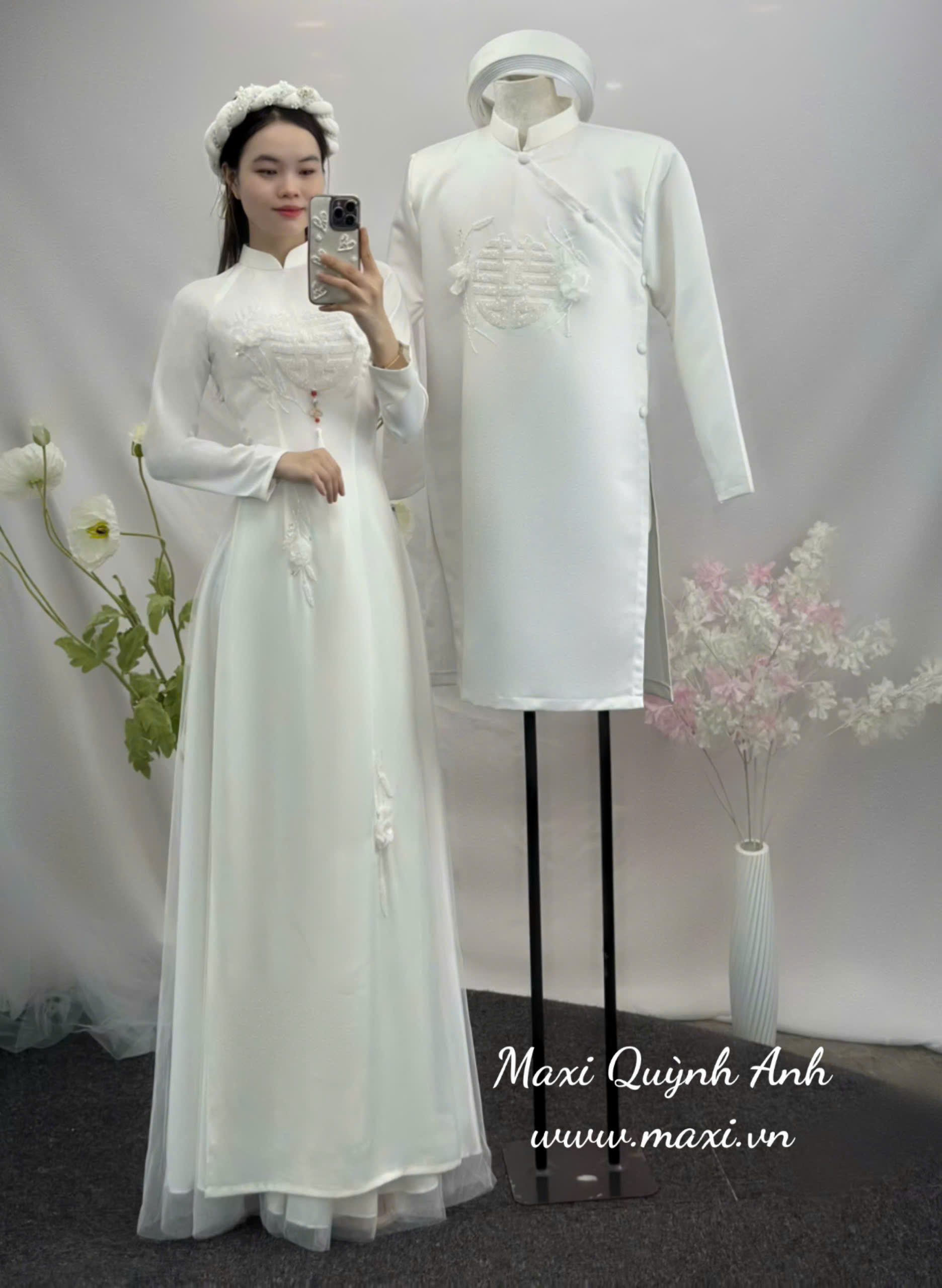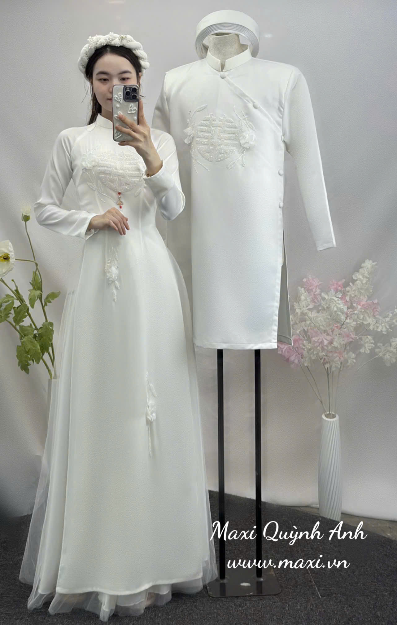 Vẻ đẹp tinh khôi, trong trẻo của tình yêu được gói trọn trong thiết kế áo dài cặp “Song Hỷ” thuần khiết. Trên nền lụa trắng thanh lịch, bộ áo dài là lời chúc phúc ngọt ngào và ý nghĩa nhất cho ngày trọng đại của hai bạn.