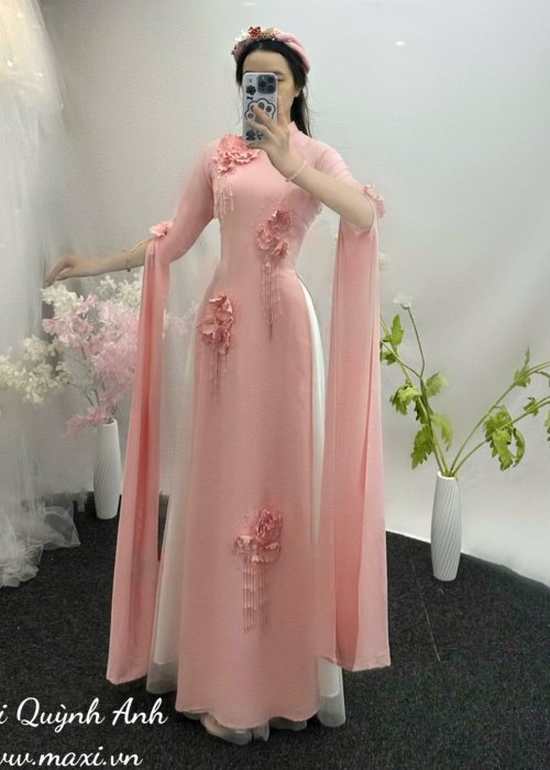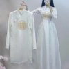 Áo dài nữ: Thiết kế dáng truyền thống ôm nhẹ, tôn lên đường cong duyên dáng. Chất liệu lụa cao cấp mềm mịn, bay nhẹ. Điểm nhấn là những bông hoa 3D kết hợp hạt ngọc đính nổi thủ công tinh xảo ở ngực, eo và tà áo, tạo hiệu ứng sang trọng, kiêu sa. Phần tay áo dài voan rủ thướt tha càng làm nổi bật nét nữ tính, dịu dàng của cô dâu.