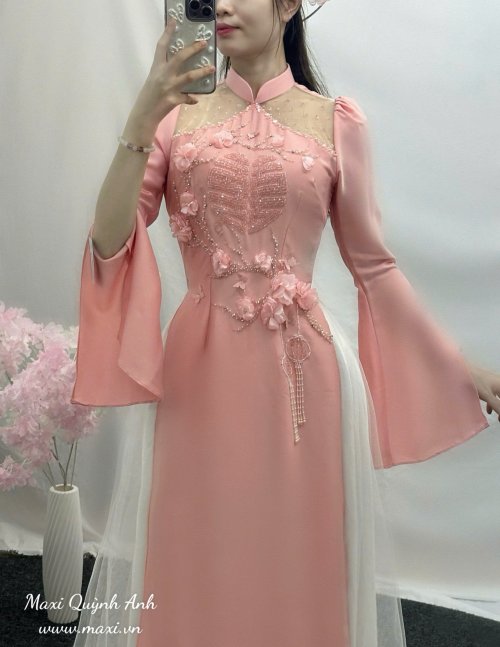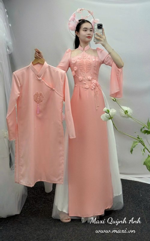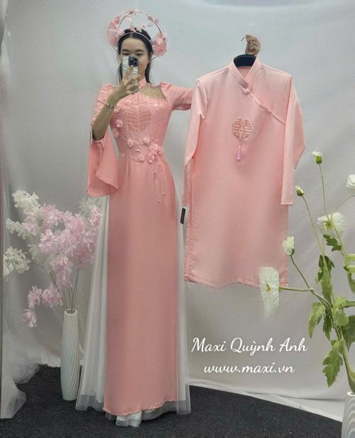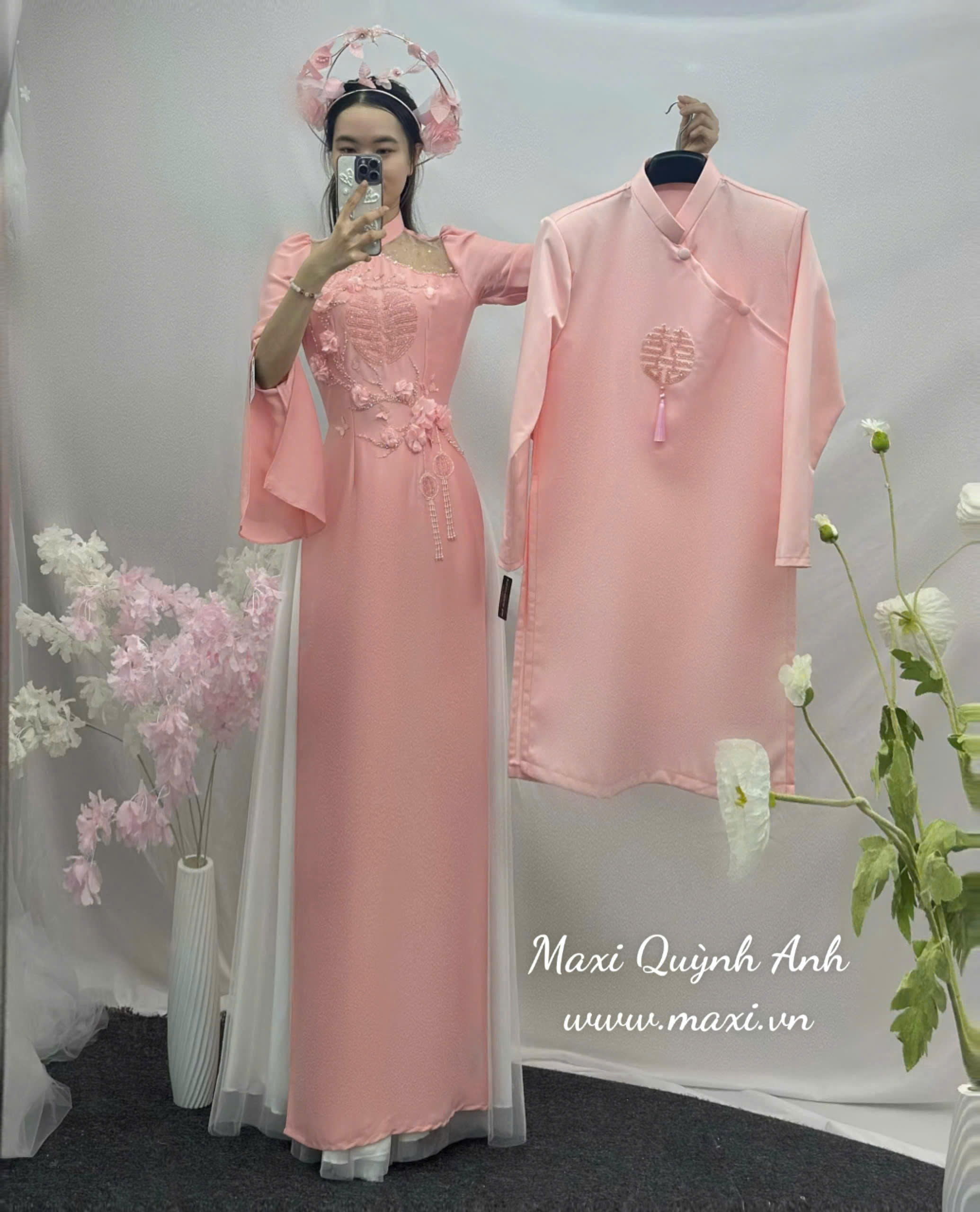 Cặp Áo Dài Cưới Hồng Hoa Tay Xẻ Cao Cấp