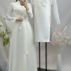 Điểm nhấn tinh tế và đẳng cấp là chữ “Song Hỷ” được kết cườm tỉ mỉ theo hiệu ứng tông xuyệt tông, tạo nên vẻ đẹp sâu lắng, sang trọng mà không hề phô trương.