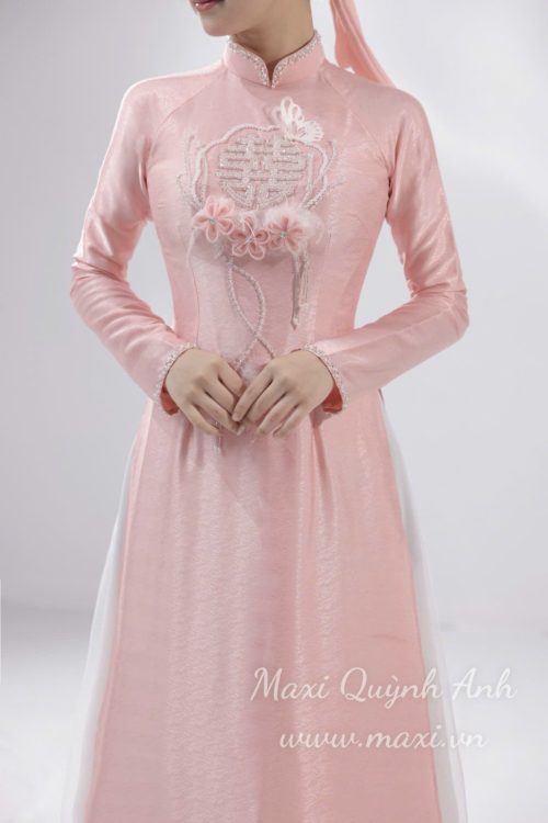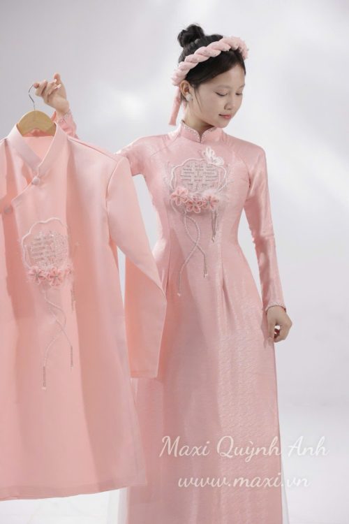 Cặp áo dài cưới hồng phấn mang đến vẻ đẹp ngọt ngào, tinh khôi và đầy lãng mạn cho ngày trọng đại. Với gam màu hồng nhẹ nhàng, bộ áo dài tượng trưng cho tình yêu trong sáng, sự e ấp và hạnh phúc viên mãn của đôi uyên ương.
