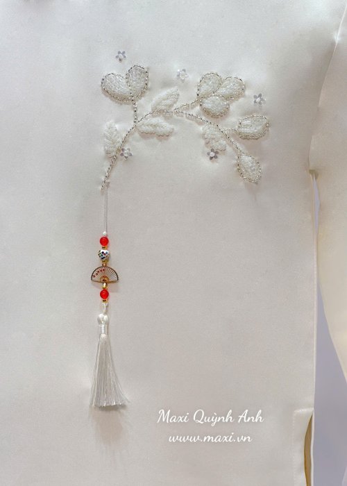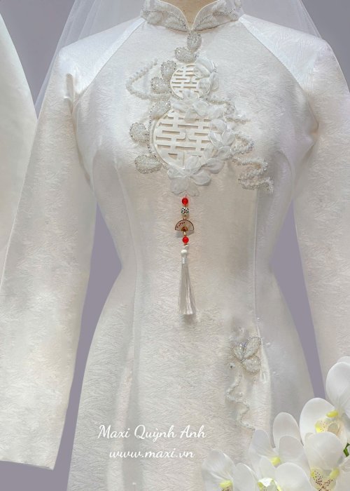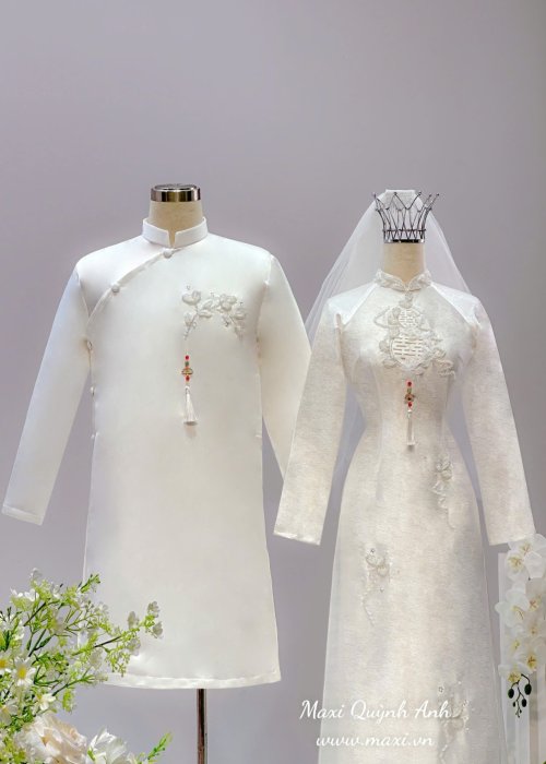 ✨ Thanh khiết và tinh khôi trong sắc trắng tinh khôi. ✨ Áo dài cưới đôi của chúng tôi là sự kết hợp hoàn hảo giữa nét truyền thống và sự sang trọng hiện đại. Với chất liệu lụa thượng hạng, từng thớ vải mềm mại ôm lấy cơ thể, tôn lên vóc dáng thanh lịch. Điểm nhấn là hoa văn thêu 3D tinh xảo, đính kèm đá lấp lánh và tua rua mềm mại, mang lại vẻ lộng lẫy, kiêu sa cho cô dâu và sự lịch lãm cho chú rể.