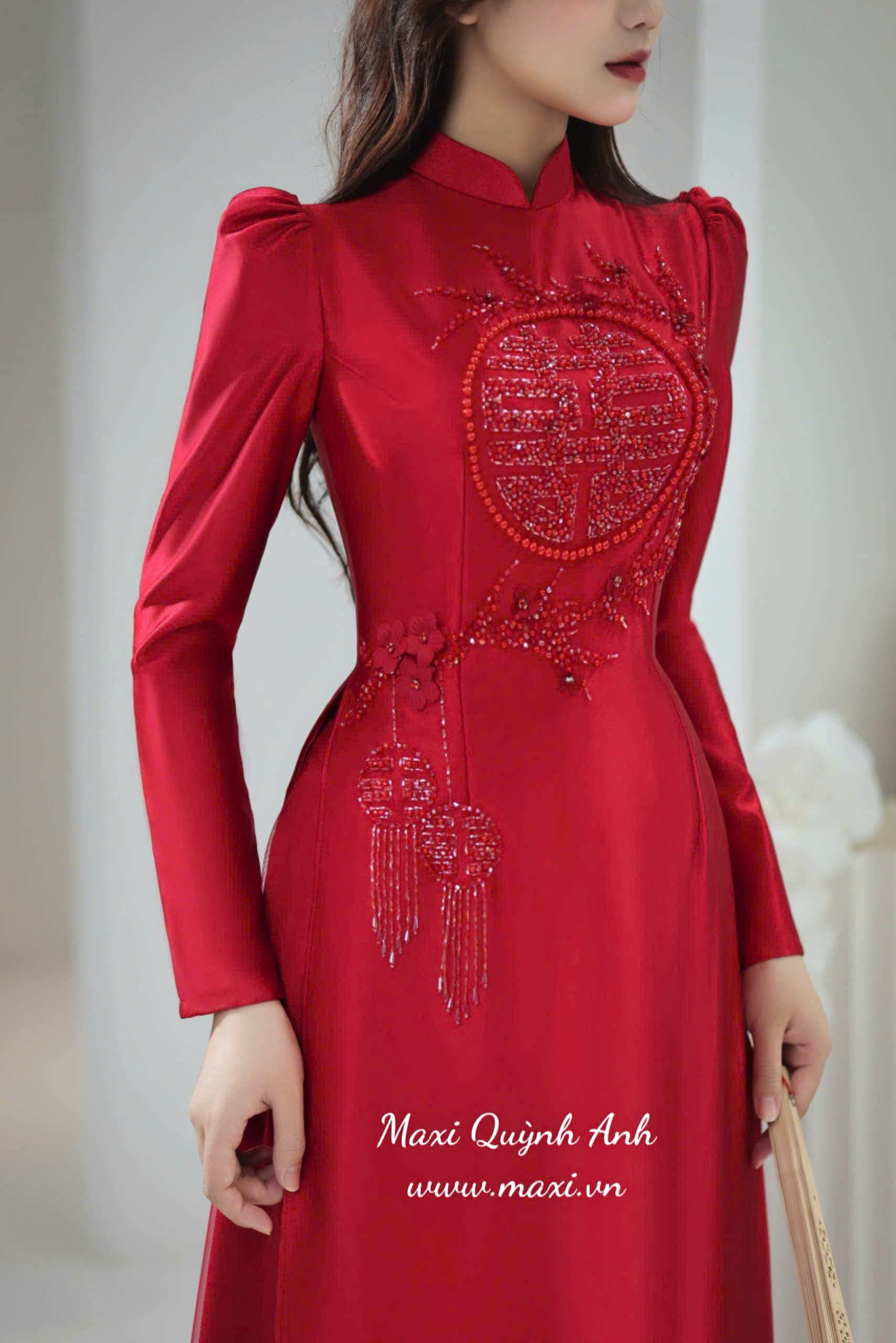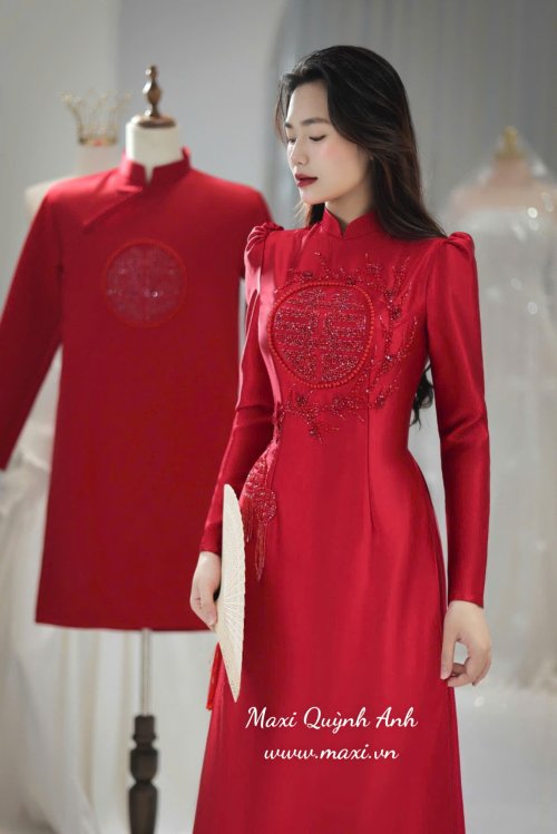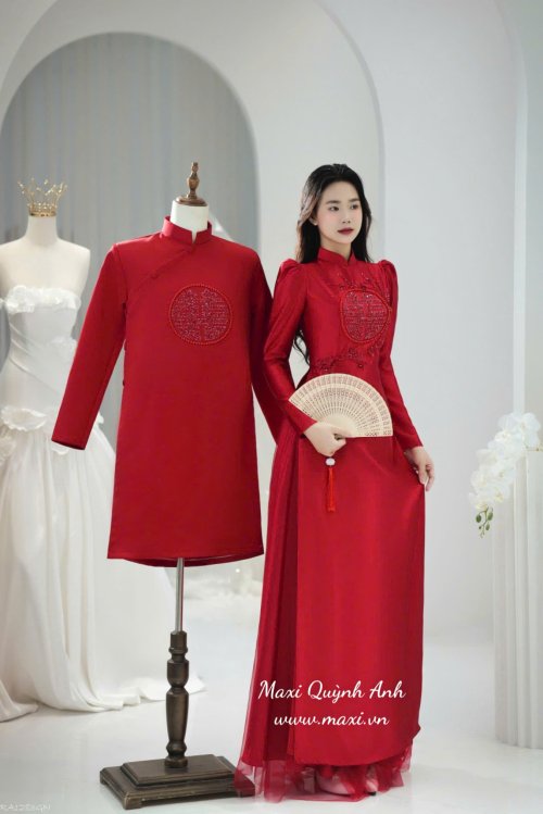 Cặp áo dài này nổi bật với tông màu đỏ thắm rạng rỡ, thể hiện ý nghĩa vận may và niềm vui sum họp trong văn hóa Việt. Chất liệu vải lụa mềm mại, bóng mượt, mang đến cảm giác dễ chịu và sang trọng khi mặc. Form dáng áo dài được cắt may tinh tế, ôm sát nhẹ nhàng, giúp tôn dáng và làm nổi bật vẻ đẹp duyên dáng, thanh lịch của người mặc. Điểm nhấn ấn tượng chính là họa tiết đính kết nổi bật, sắc nét ở phần ngực, kết hợp hài hòa với những hoa văn truyền thống tinh xảo trên nền vải, tạo nên nét đẹp vừa cổ điển vừa hiện đại. Tổng thể, bộ áo dài thể hiện sự phối hợp hoàn hảo giữa vẻ đẹp truyền thống và sự tinh tế đương đại, rất thích hợp cho những dịp lễ trọng đại và sự kiện quan trọng của cặp đôi.