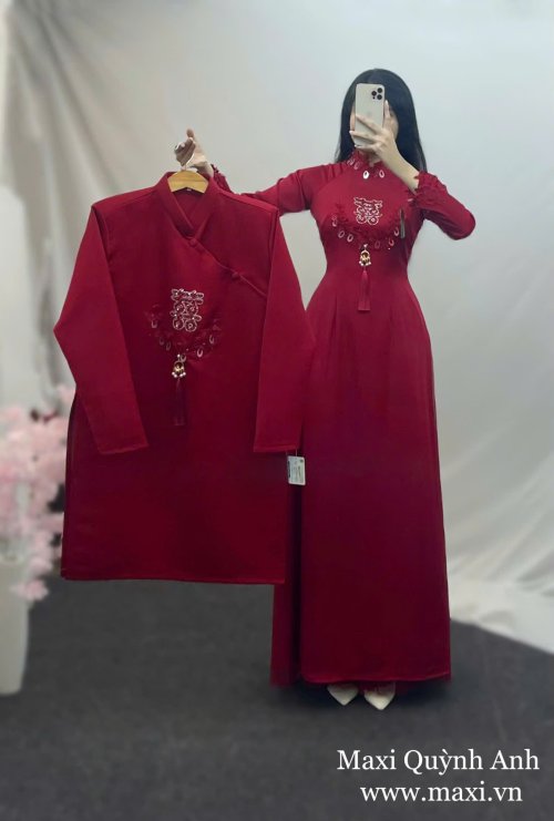 Áo dài nam lịch lãm, đồng điệu sắc đỏ, vừa mạnh mẽ vừa ấm áp.