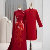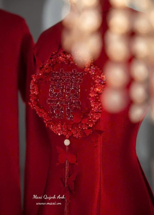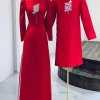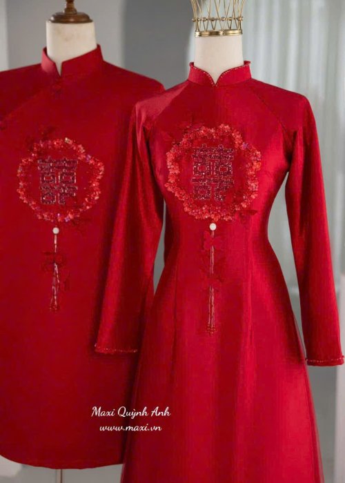 Mẫu áo dài này được thiết kế dành cho cặp đôi với tông màu đỏ nổi bật, mang ý nghĩa may mắn và hạnh phúc trong văn hóa Việt Nam. Chất liệu vải có độ bóng nhẹ, mềm mại, tạo cảm giác thoải mái khi mặc. Form dáng áo dài ôm nhẹ, tôn lên vẻ thanh lịch và duyên dáng. Thiết kế nổi bật với họa tiết chữ in đậm tinh xảo ở phần ngực, cùng các chi tiết hoa văn truyền thống được thêu tỉ mỉ, tạo điểm nhấn sang trọng và ấn tượng cho trang phục. Phong cách hiện đại pha trộn với nét truyền thống, phù hợp cho các dịp lễ, cưới hỏi hoặc sự kiện đặc biệt, thể hiện sự trang trọng và tinh tế