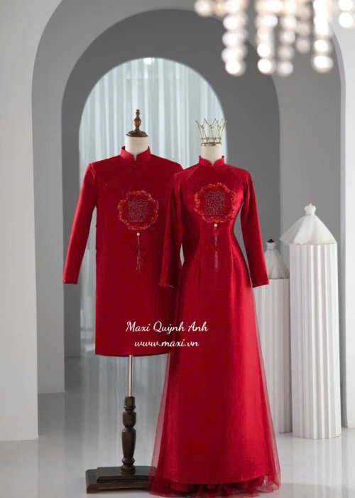 Mẫu áo dài này được thiết kế dành cho cặp đôi với tông màu đỏ nổi bật, mang ý nghĩa may mắn và hạnh phúc trong văn hóa Việt Nam. Chất liệu vải có độ bóng nhẹ, mềm mại, tạo cảm giác thoải mái khi mặc. Form dáng áo dài ôm nhẹ, tôn lên vẻ thanh lịch và duyên dáng. Thiết kế nổi bật với họa tiết chữ in đậm tinh xảo ở phần ngực, cùng các chi tiết hoa văn truyền thống được thêu tỉ mỉ, tạo điểm nhấn sang trọng và ấn tượng cho trang phục. Phong cách hiện đại pha trộn với nét truyền thống, phù hợp cho các dịp lễ, cưới hỏi hoặc sự kiện đặc biệt, thể hiện sự trang trọng và tinh tế
